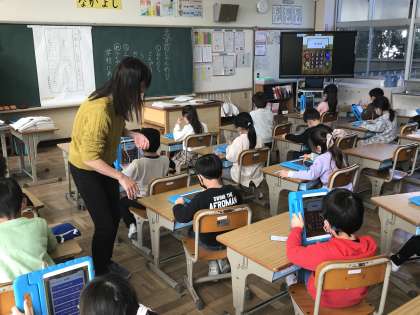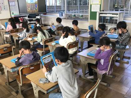 タブレットドリルで算数の学習をする様子です。