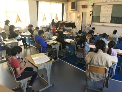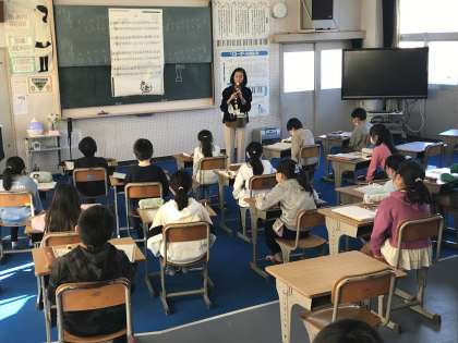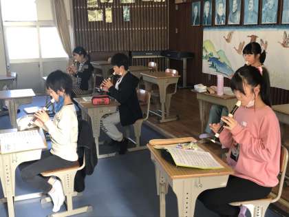 音楽のリコーダー練習に取り組む様子です。小山先生自らお手本を示す様子も見られました。
