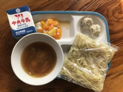 ちゅうかめん・牛乳・ごもくラーメンのスープ・しゅうまい・フルーツあんにん