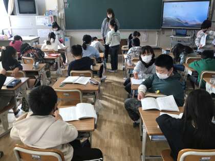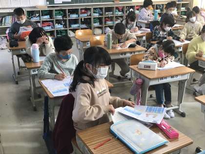 国語で知多の友に取り組んだり,理科のテスト直しに取り組んだりする様子です。
