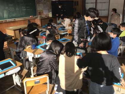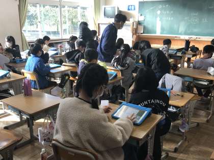ICT支援員からタブレット端末の活用について学ぶ様子です。