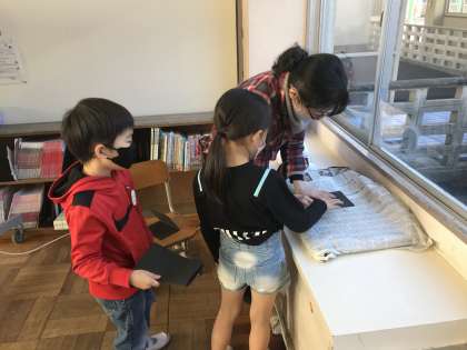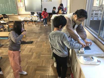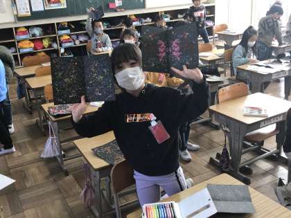 クーピーの削りカスを活用して作品作りする様子です。