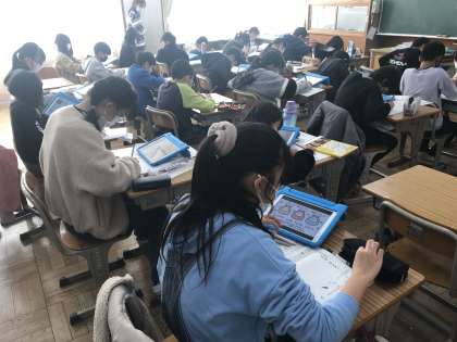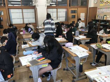 書写の時間で年賀状作成に取り組む様子です。一人ひとりが工夫を凝らしながら取り組んでいました。