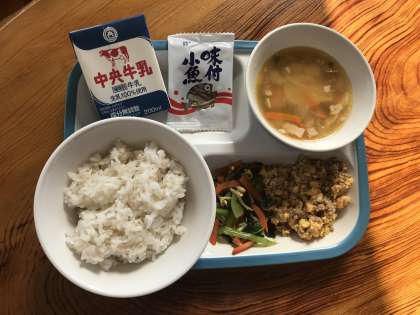むぎごはん・牛乳・ビビンバのぐ(にく・たまご・やさい)・ワンタンスープ・かんそうこざかな