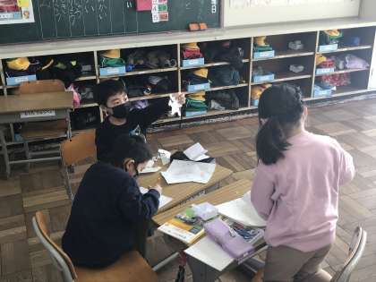 グループごとに分かれてくじ引き等の企画・準備をする様子です。