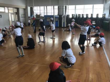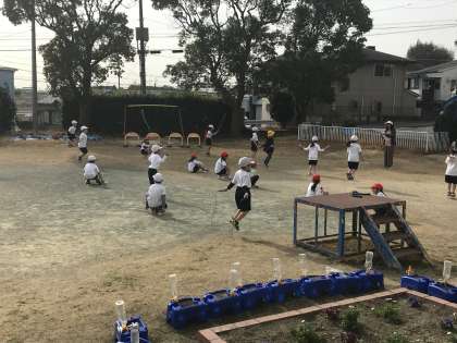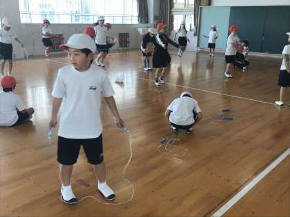 前庭やプレイルームで縄跳び運動に取り組む姿が見られました。