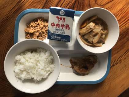 ごはん・牛乳・さけとあおなごはんのぐ・とりにくのごまだれかけ・なまあげのうまに