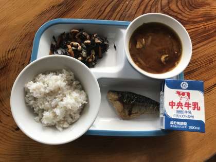 むぎごはん・牛乳・さばのしおやき・だいずとひじきのにもの・ぶたじる