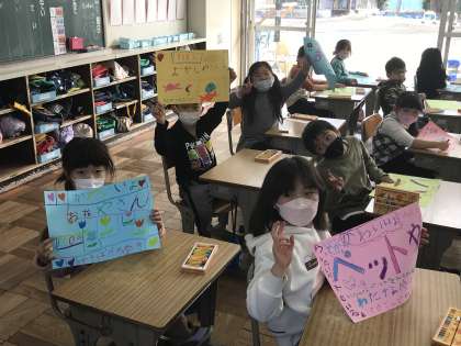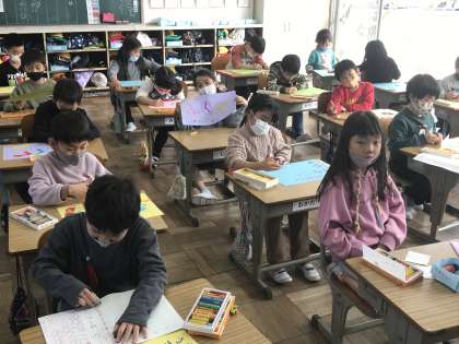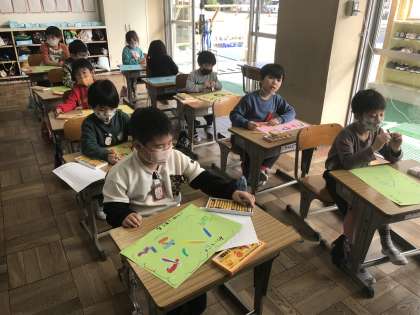 お店屋さんのポスターを作成していました。「安いよ!安いよ!」など,お客さんを引き寄せるメッセージまで工夫していました。