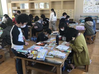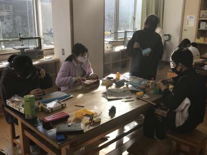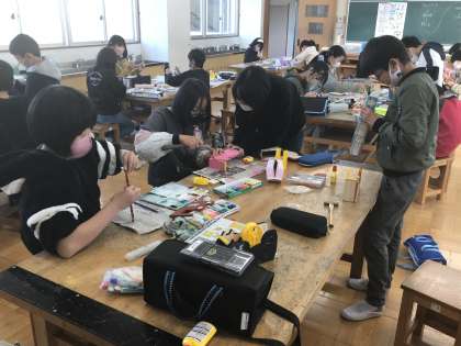 図工のテープカッター作りに取り組む様子です。完成が楽しみです。