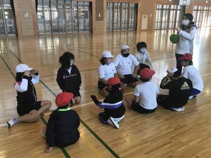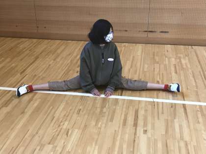 ドッジボールのチームごとに並ぶ様子です。準備運動では,抜群の柔軟性が輝いていました。