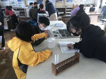 理科の実験をグループごとに取り組む様子です。