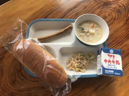 みそパン・牛乳・やきソーセージ・ふゆやさいのクリームシチュー・ダイコンサラダ(ごまドレッシング)