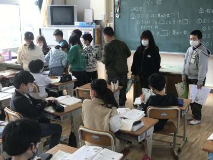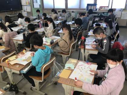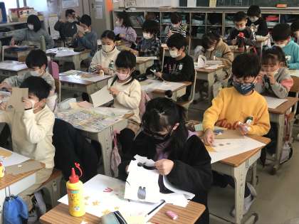 算数の答え合わせや図工の作品作りに取り組む様子です。
