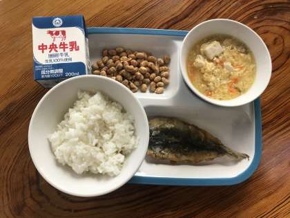 ごはん・牛乳・いわしのかばやき・だいずのきなこがらめ・かきたまじる