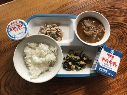 ごはん・牛乳・ぶたにくのしょうがやき・ひじきのあえもの・ふゆやさいのみそしる・ヨーグルト