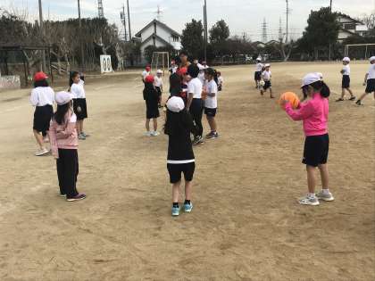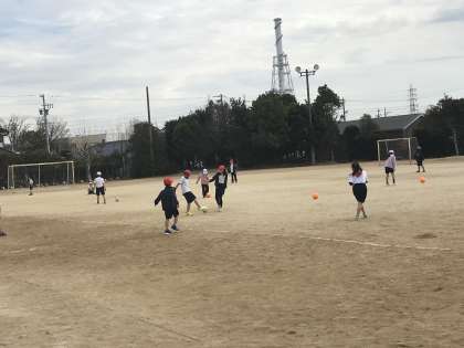 グラウンドでサッカーボールを使ってミニサッカーに取り組む様子です。