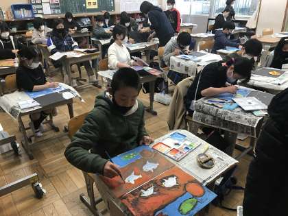 「食塩が水に溶ける量には限界があるのか」について学習したり,図工の版画作品作りに取り組んだりする様子です。