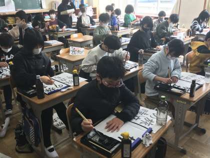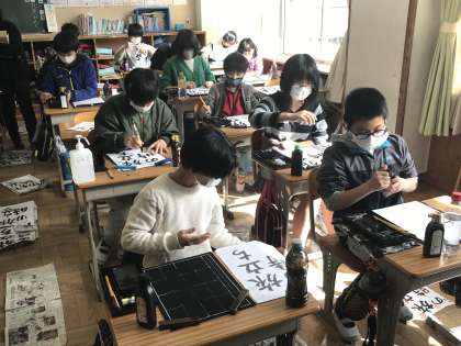 書写「旅立ちの時」の練習に取り組む様子です。卒業期にぴったりの題材です。
