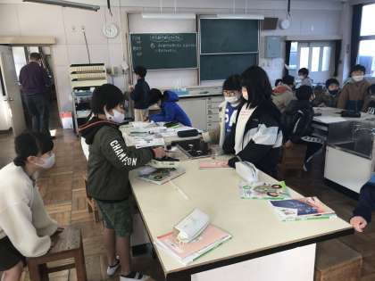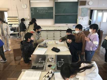 理科「水をあたためたときの変化」についてグループ学習する様子です。