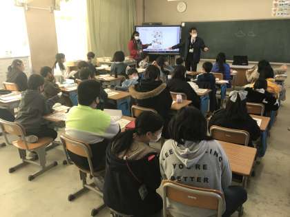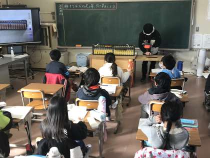 ALTの先生とコミュニケーションを楽しんだり,そろばんを使った「たし算・ひき算」の学習をしたりする様子です。