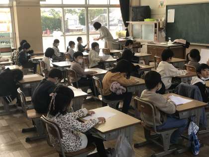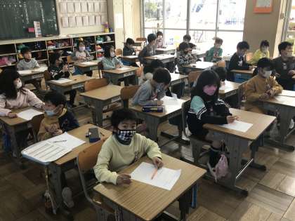 抜き打ち不審者訓練の振り返りカードを記入する様子です。1年生の子どもたちは,訓練による不審者の発見がとても早く,教室の戸締りをして侵入を防ぎ,逃げる姿はさすがでした。