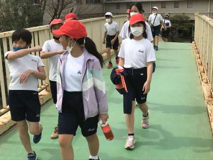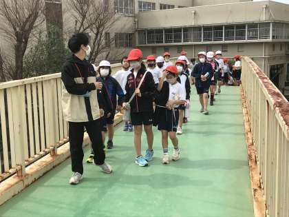 体育の学習のため,大橋を渡ってグラウンドに移動する様子です。