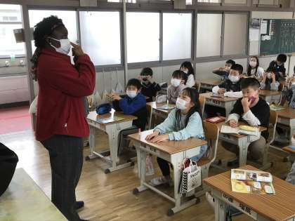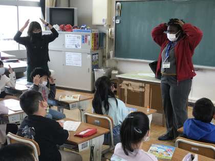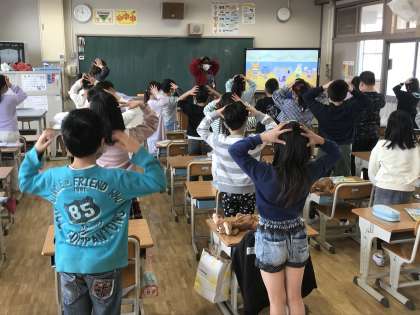 外国語活動でALTの先生と楽しく体を使ってコミュニケーションを図っていました。