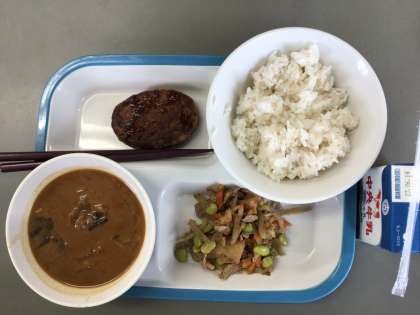 今日の献立は、むぎごはん、てりやきハンバーグ、きんぴらごぼう、とうにゅういりみそしる、牛乳です。