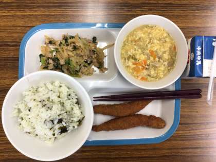 今日の献立は、わかめごはん、ししゃもフライのレモンソースかけ、こまつなのごまあえ、かきたまじる、牛乳です。