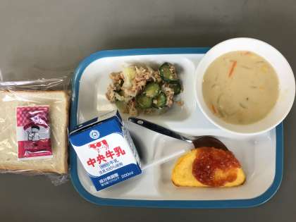 今日の献立は、スライスパン、オムレツのトマトソースかけ、ツナサラダ(こうみじおドレッシング)、コーンスープ、だいずチョコクリーム、牛乳です。