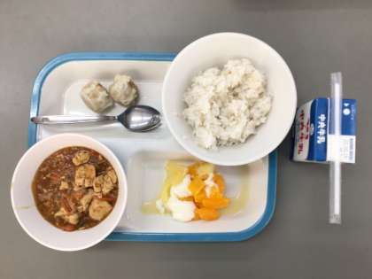 今日の献立は、むぎごはん、マーボーどうふ、しゅうまい、あんにんフルーツ、牛乳です。