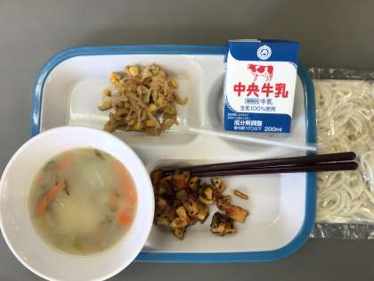 今日の献立は、ソフトめん、ちゃんぽんスープ、だいがくいも、きりぼしだいこんのちゅううかあえ、牛乳です。
