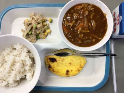 今日の献立は、むぎごはん、ハヤシライス、オムレツ、ごぼうサラダ、牛乳です。