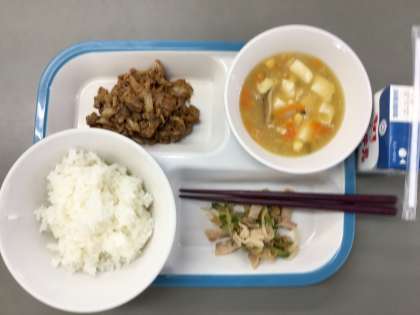 今日の献立は、ごはん、ぶたにくときゃべつのみそいため、バンサンスー、ちゅうかコーンスープ、牛乳です。