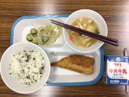 今日の献立は、わかめごはん、にぎすフライのレモンソースかけ、ぞうに、たくあんあえ、牛乳です。