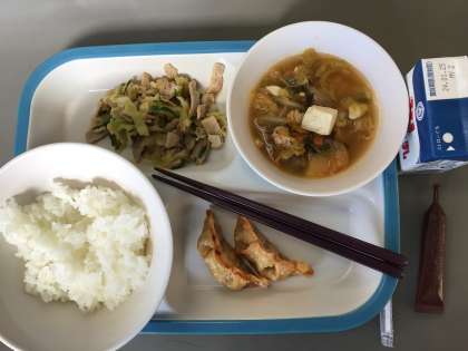 今日の献立は、ごはん、あげぎょうざ(小2こ)、バンサンスー、キムチスープ、ココアぎゅうにゅうのもと、牛乳です。