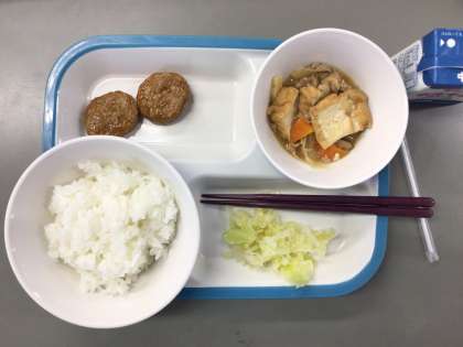 今日の献立は、ごはん、しろごまつくね、なまあげのうまに、こうのものあえ、牛乳です。