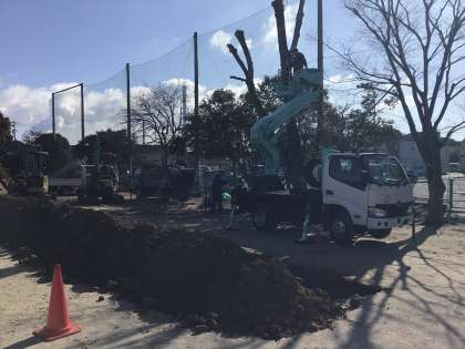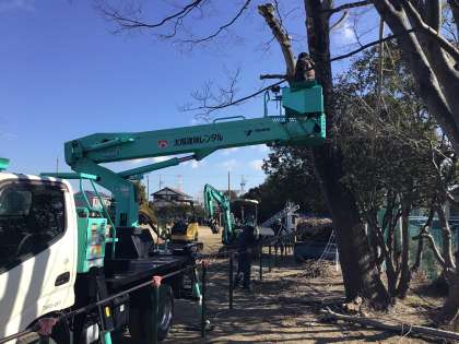 運動場南側の高木の選定作業を行っています。