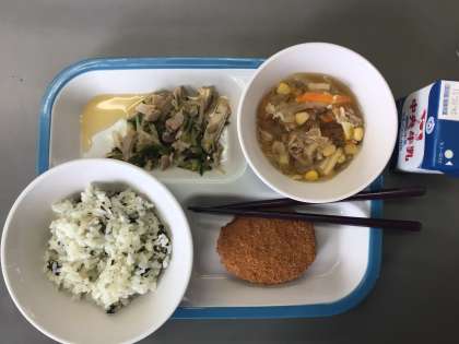 今日の献立は、わかめごはん、コロッケ、バンサンスー、はるさめスープ、牛乳です。