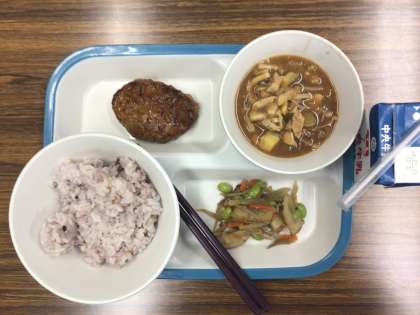 今日の献立は、ごこくごはん、ハンバーグのおろしポンずかけ、きんぴらごぼう、さつまじる、牛乳です。