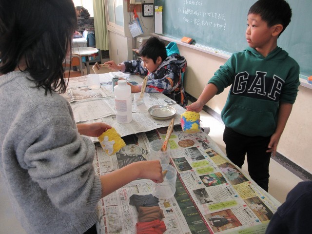 今日のふきっ子3年生の授業の様子です。今日は、作った作品にニスをぬりました。