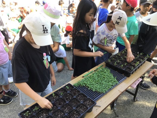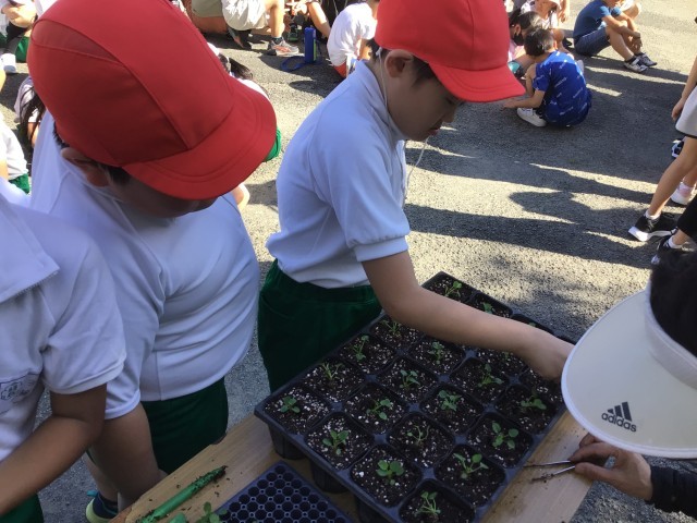 4年生みんなで、北澤農園さんに教えていただき、ビオラの苗をポットに植えました。