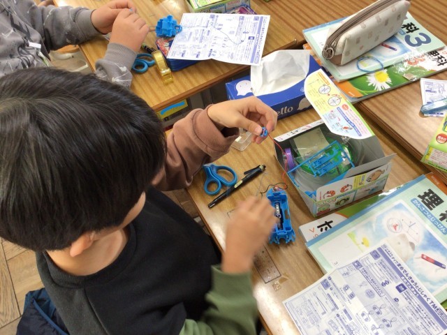 理科は、電気のことや磁石のことについて勉強をしています。キットを楽しそうに組み立てながら実験をしています。