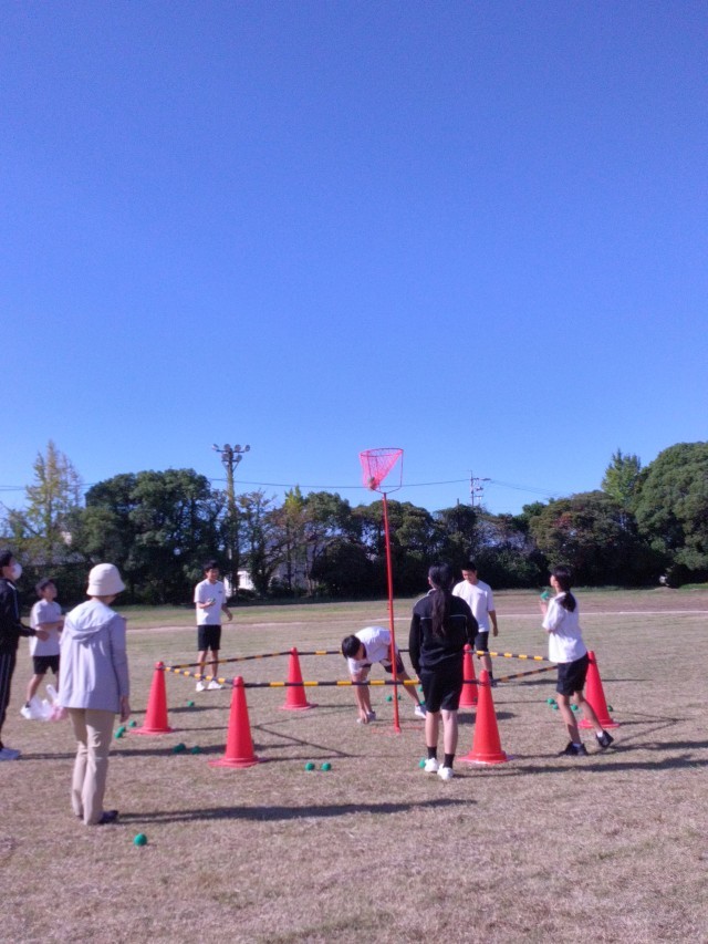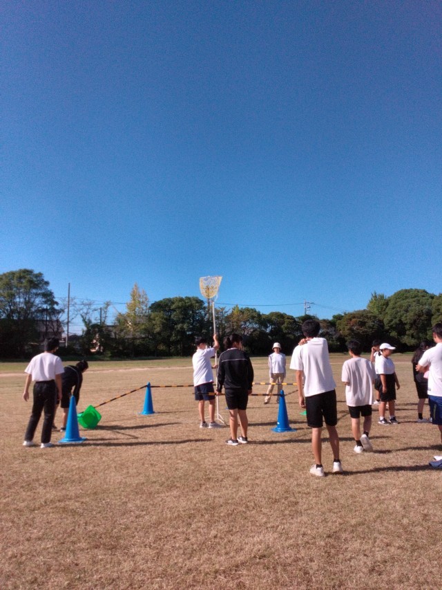 体育の授業では体育祭の練習をしています。準備をして、それぞれの団の色別に並び、玉入れをしました。本番も頑張ってください!