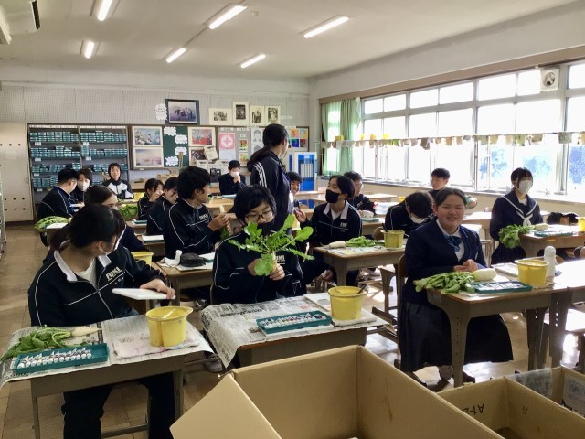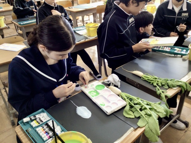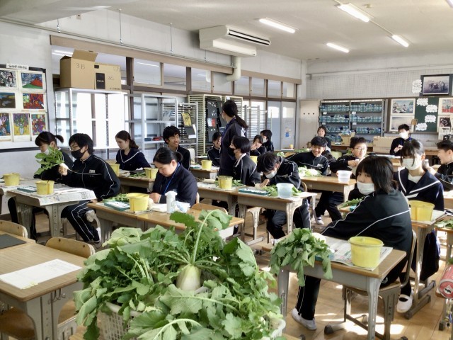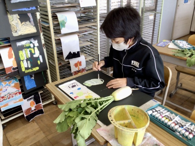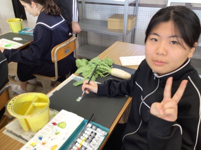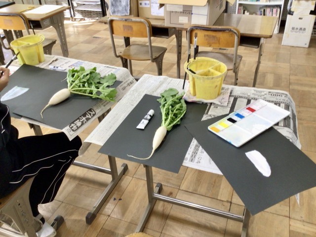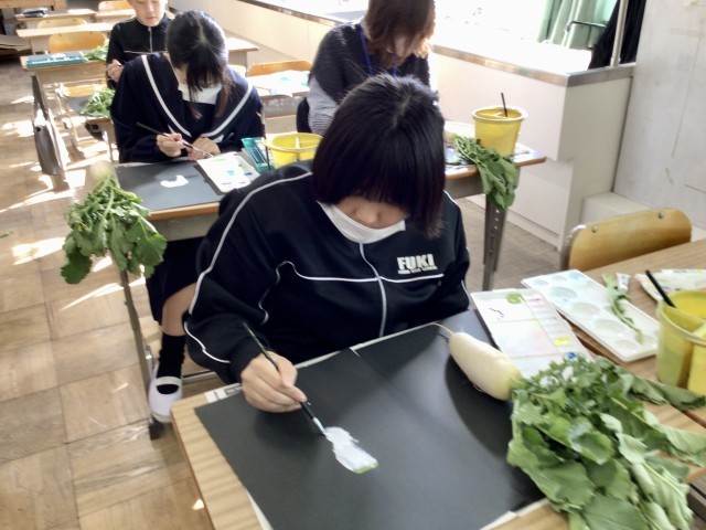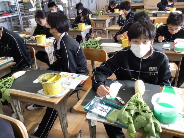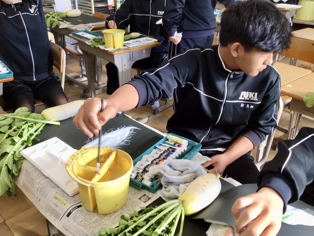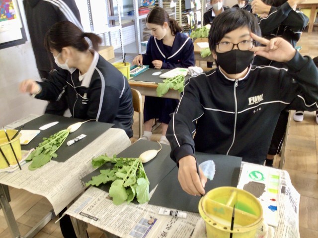 F組の畑で大根が収穫できました。食べる前に美術の授業で絵を描いています。葉の間から虫が出てきてびっくりしている生徒もいました。よく観察して細かいところまで丁寧に書くことができました。