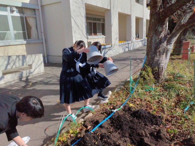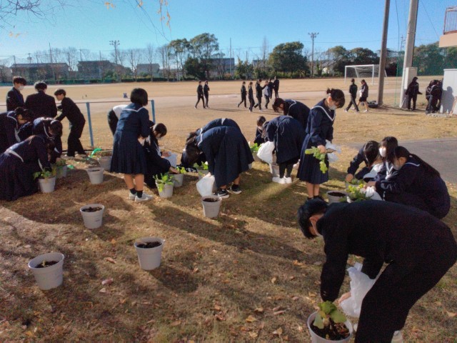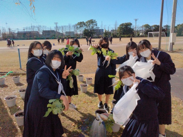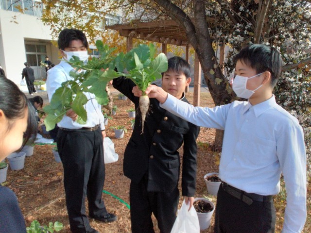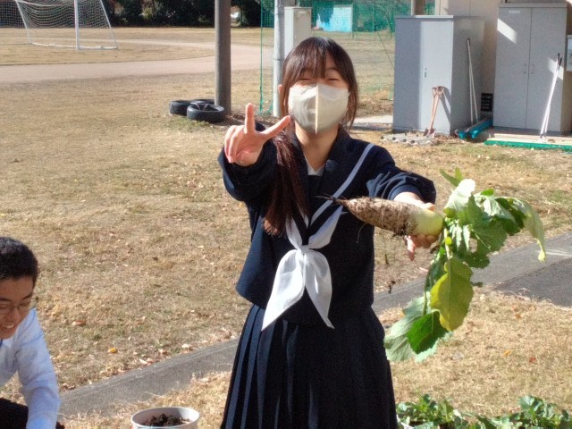 3年生技術の授業で秋から育ててきた大根が、収穫の時期を迎えました。種をまいた日から、間引きや追肥、水やりなど、生徒たちは手をかけて丁寧に育ててきました。