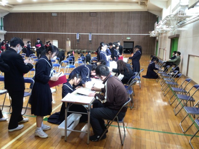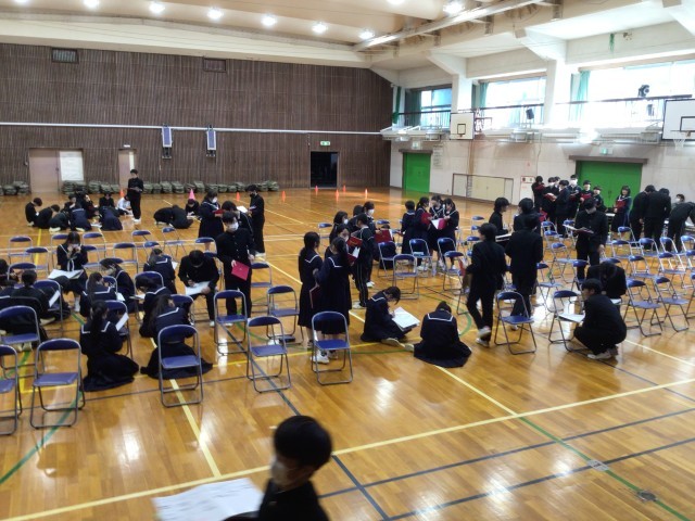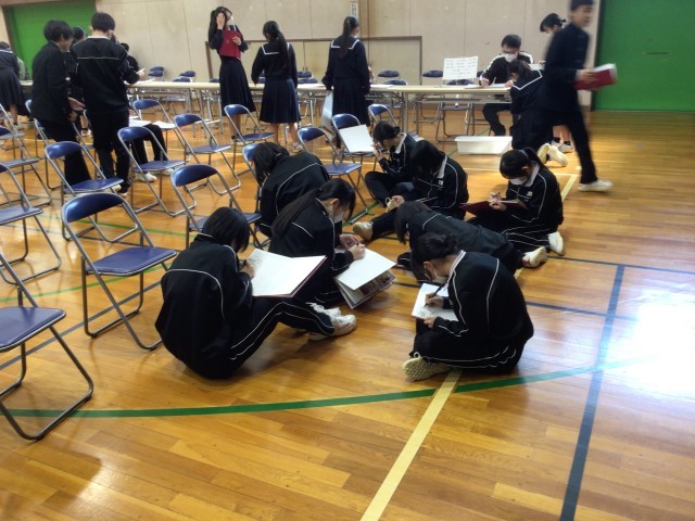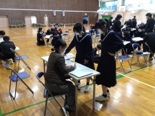 購入していただいた卒業アルバムが生徒の手元に届きました。ページをめくりながら仲間と過ごした時間の尊さを改めて感じる様子が伝わってきました。卒業アルバム交流の時間では、互いにメッセージを書き合ったり、先生方からメッセージを書いてもらったりしていました。学年の絆を感じさせる温かい時間となりました。