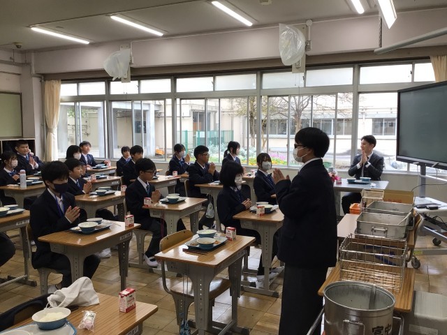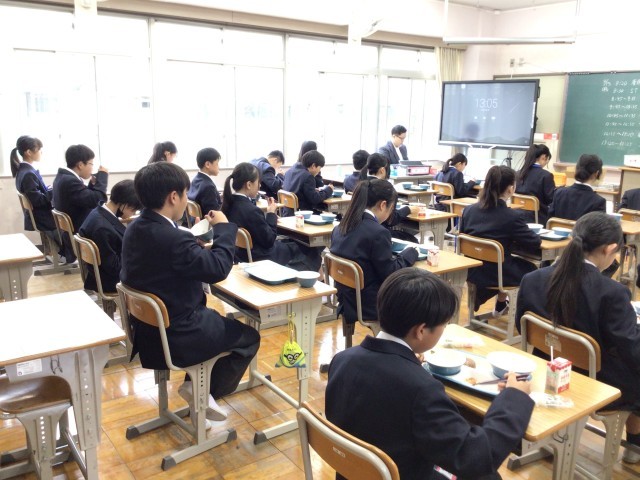 中学校生活の給食が始まりました。配膳の仕方や当番の役割など、初めてのことに戸惑いながらも協力して準備を進めることができました。和やかな雰囲気の中で食事ができ、給食の時間が学校生活の楽しみの一つになることが期待できそうです。