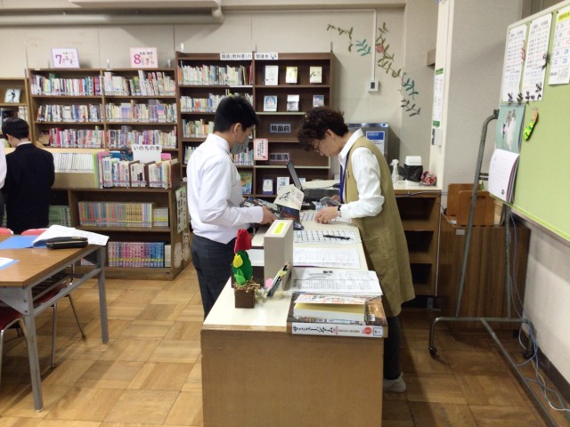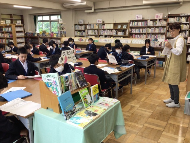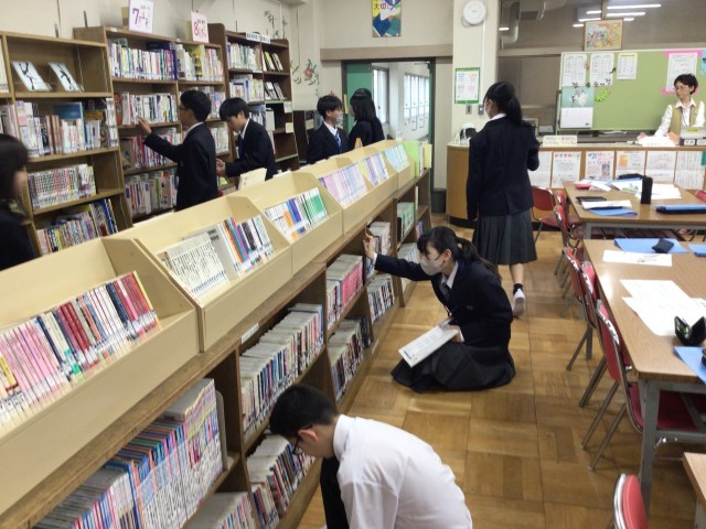 国語の時間に、学校図書館の利用指導をしました。本の分類や貸し出しのルールを確認し、実際に本を借りました。生徒たちは興味のある本を見つけながら、図書館に親しむことができました。